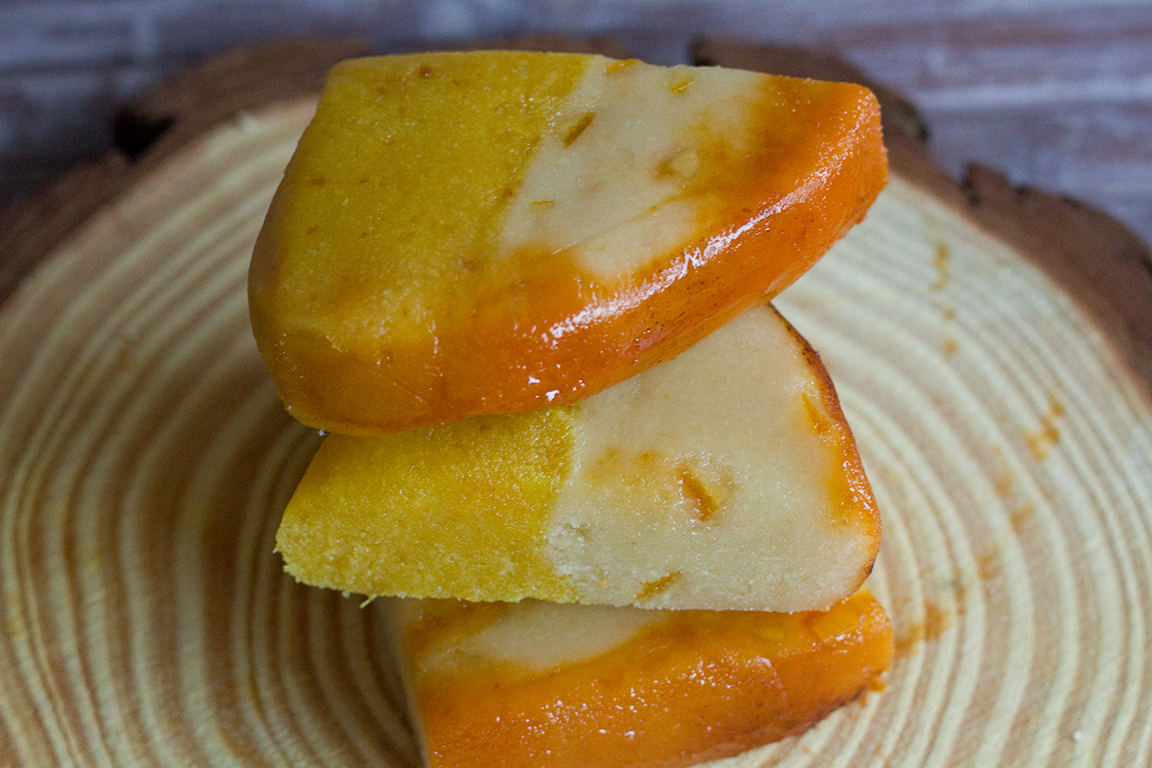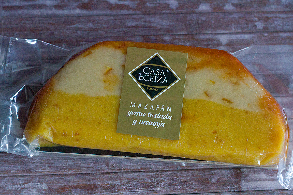 Mazapán artesanal suave de yema tostada con un ligero toque a naranja.